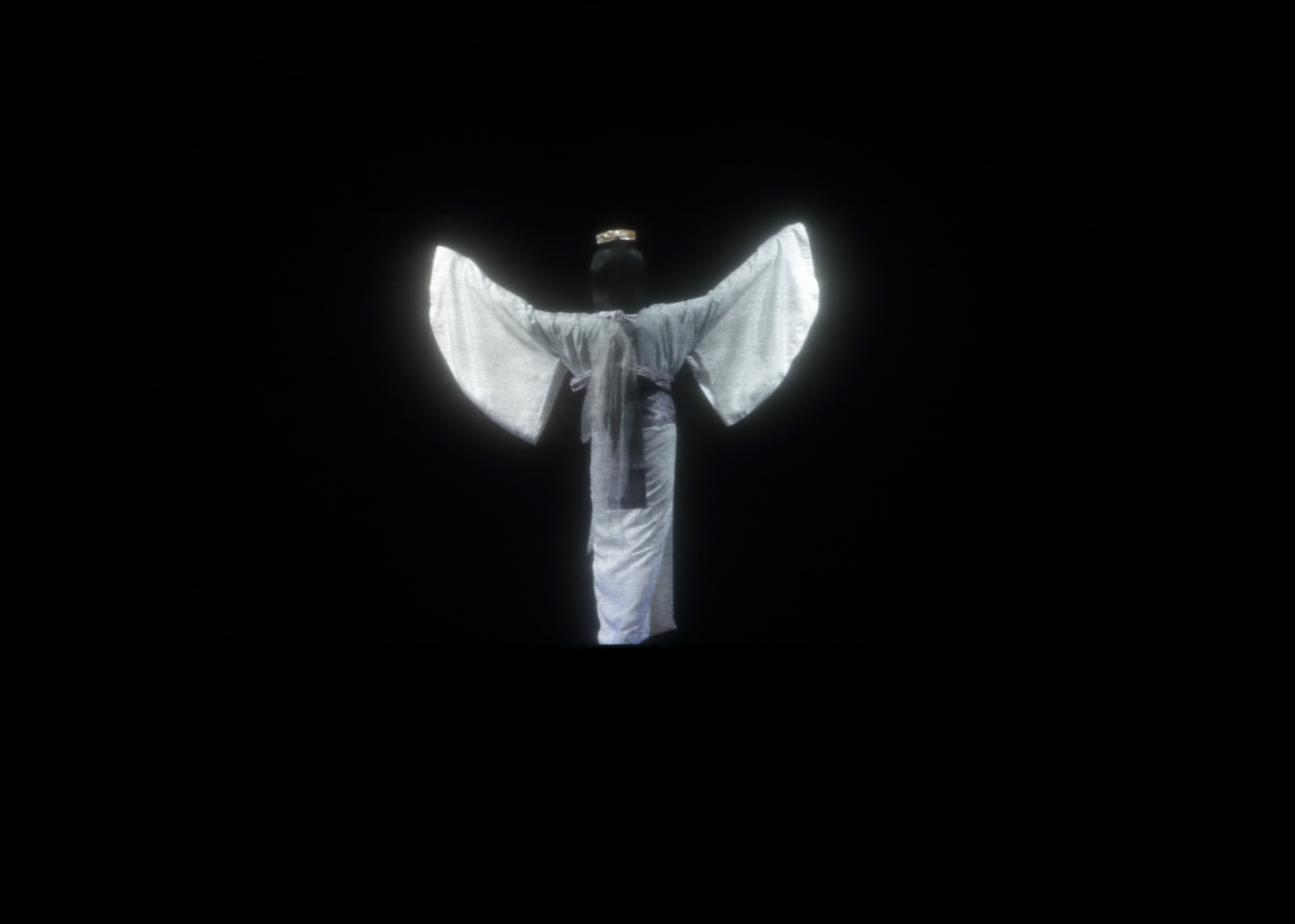 すると、どこからともなく天の声が、魂送りの歌声が聞こえてくる。天から一枚の羽衣が風に乗って舞い降りてきた。